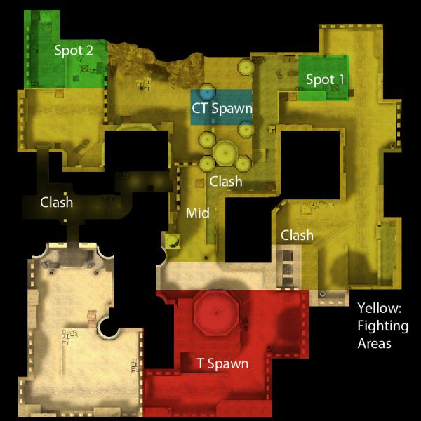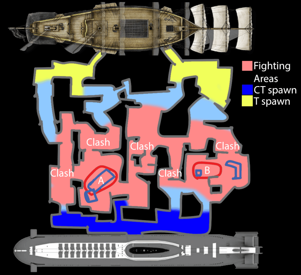 These images are taken from this tutorial for creating Counter-Strike maps. Despite it being 13 years old, it covers concepts that are still entirely relevant for modern Counter-Strike (Dust 2 is still almost entirely unchanged to this day). The main takeaway from this post is to focus on player interaction; the teams should meet at certain points in the map and ‘clash’. This terminology is not used often anymore, however the idea behind it is relevant.