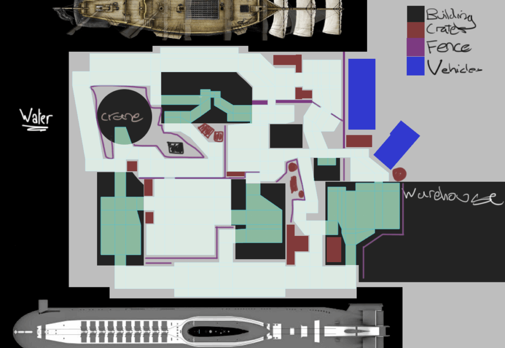 In this image you can see I’ve taken the time to overlay plans of where buildings, crates and fences will go on top of the in-engine layout.
