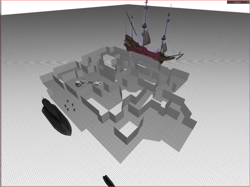 In the image on the left, you can see that I have now extruded the layout into 3D rooms. I also added CT and T spawns, and a submarine and ship model I found on Sketchfab and Poly Haven respectively.