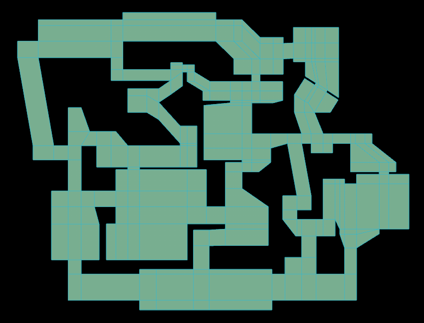 With this layout in place, I can now extrude it and create an interior. The walls and ceiling will be using the ‘skybox’ texture, which will end up looking see-through, however it is important to use, otherwise I’ll end up with bad performance when building and running the map.